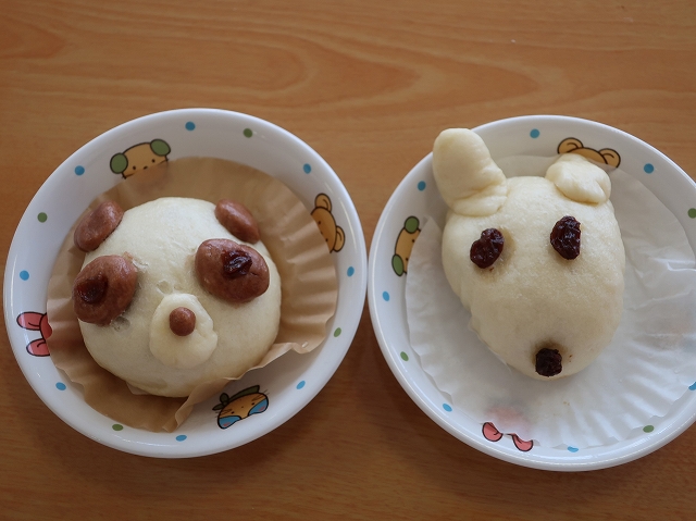 さて蒸しあがってみると、パンダの顔はなかなか。ウサギは失敗。でも娘は超嬉しそうでした。