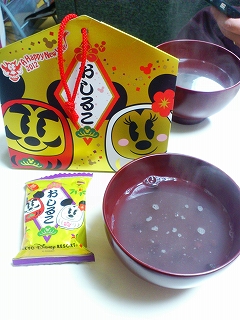 この時期らしい、渋いミッキーが印象的なおしるこを貰いましたので、さっそくいただきました。