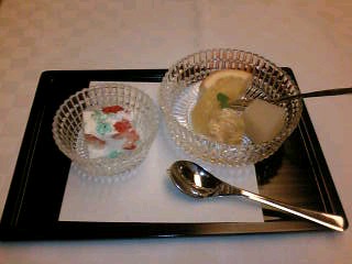 苺のムース?と右の方はよく分かりませんが、寒天とおぼしきものに
