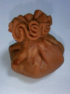 中の餡は、ボソボソッとしていて、かなりきつい香り ―それこそお寺のお香のような― がします。説明書きによると白檀、丁子(クローブ)、ニッキなど七種の「清め」の香りが混ぜ込んであるとのこと。それはすごい香りになるでしょうよ。