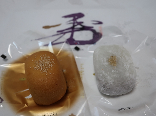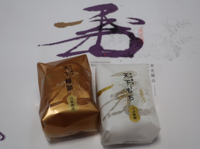 この商品は2種の和菓子がセットになっており、金の包み紙の方が「天下饅頭」という名前の白あんのお饅頭、銀(というか白)の包み紙の方が「天下もち」という名前の大福です。