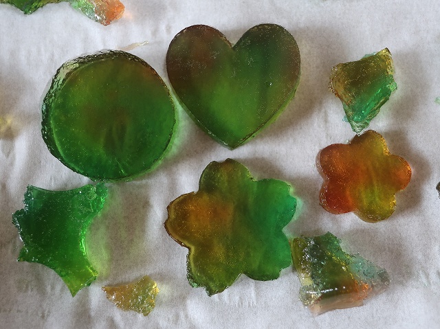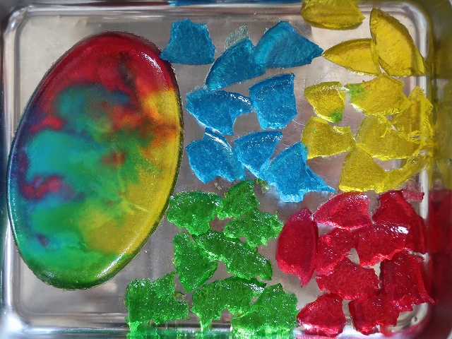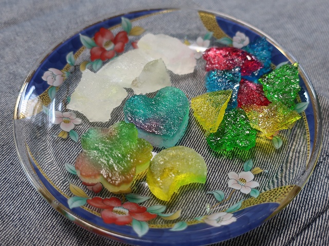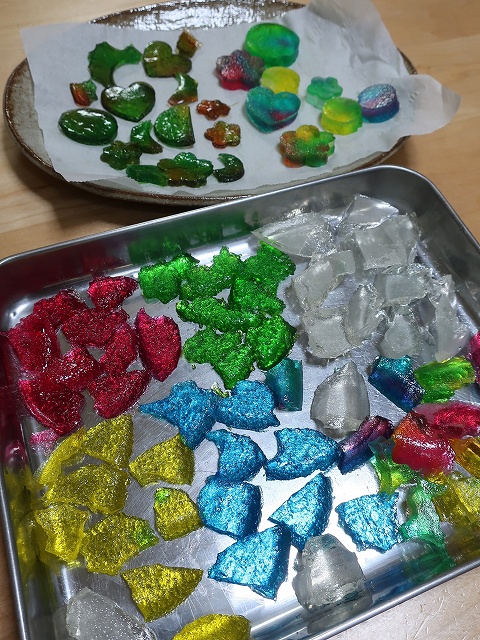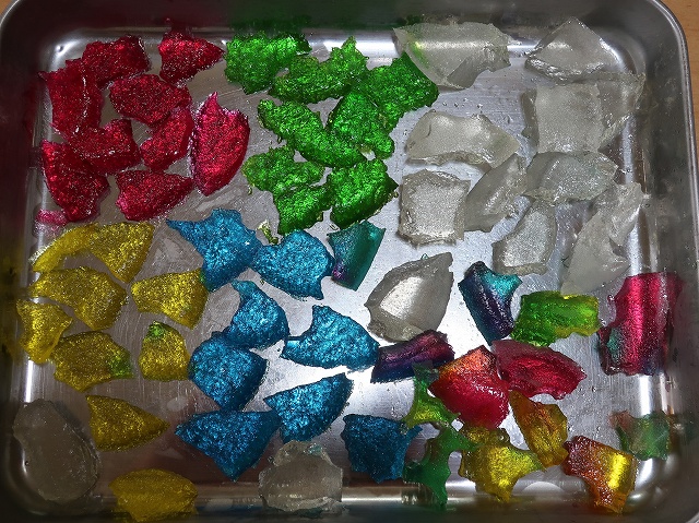 透明液の方はキレイに表面がざらついて、宝石のような美しい琥珀糖になりました。