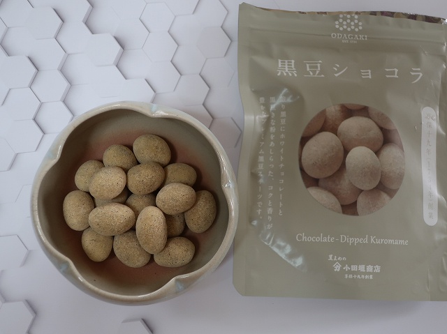 炒った黒豆にチョコと黒豆きな粉をまぶしたもので、大豆でこういうお菓子よく見るけど、大豆よりも大きく、そしてカリっとした大豆よりもわずかにもっちりとしたリッチな歯ごたえで、とても美味しかったです。