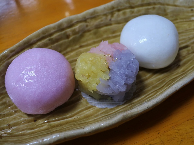 薯蕷饅頭と練り切りと花びら餅。