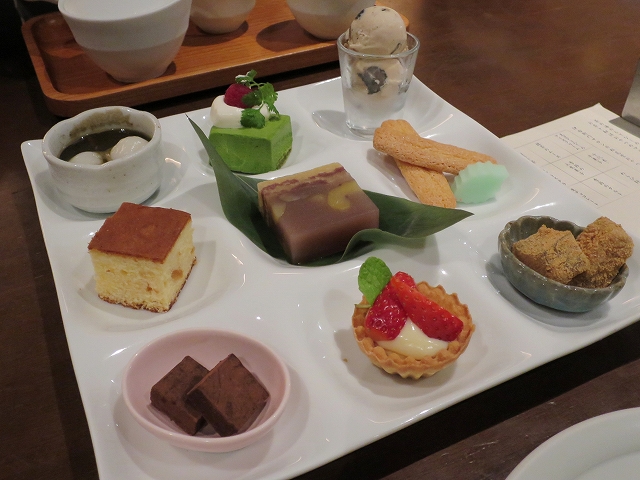 松花堂と言うだけあって、マス分けにされた皿の上に、なんと9種類ものスイーツが乗せられていますよ。