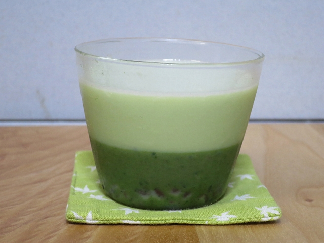 こう書くと簡単そうですが、牛乳はうっかり沸騰しちゃうし、きれいに寒天と抹茶を溶かすのが面倒だった。結局抹茶はダマが残りました。