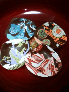 画像を見てください。なんて雅で乙女チックな絵柄。右上から時計回りにそれぞれ鞠(秋)、紫の上(春)、源氏(夏)、明石の君(冬)という銘がついています。