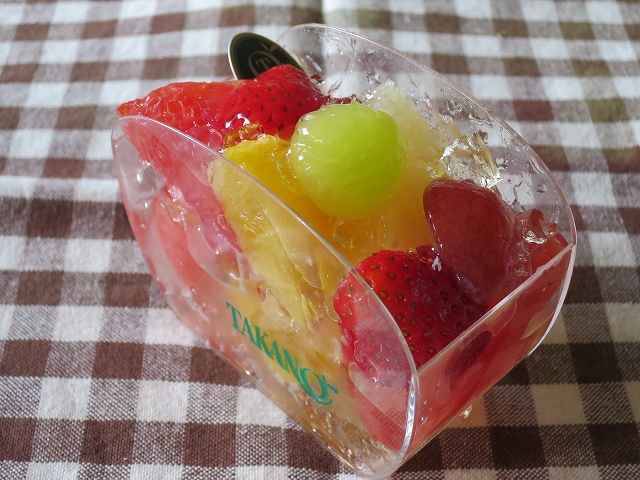 フルーツのジュレ掛けでスポンジ素材などはなく、カラフルな果物が底まで目いっぱい入ってます。