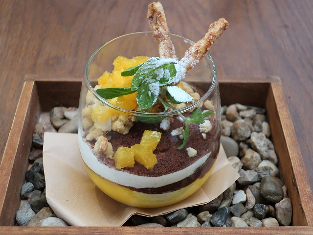 石が敷かれているプレートの上に、オレンジの鮮やかさとレイヤーが美しいグラス入りのティラミス。
