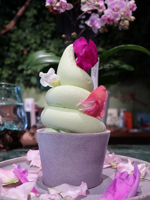 ライトグリーンの大ぶりのソフトクリームに花びらが散らされて、もはや芸術です。