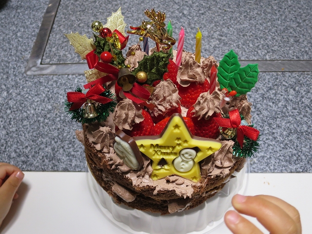 最後に息子がイチゴを置いて、飾りチョコと義実家にあったクリスマスモチーフのピックを刺して刺して刺しまくって完成ーーー!!