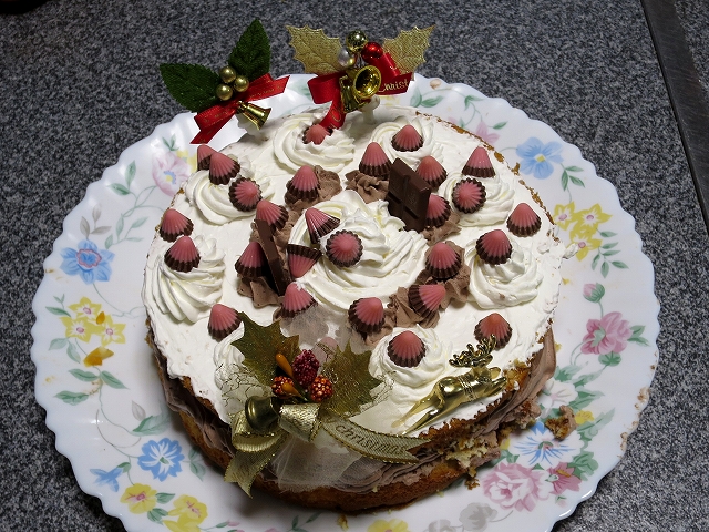 クリームの上にアポロとクリスマス飾りを息子がデコレートして完成~。