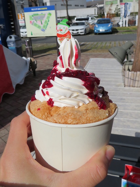 これを寒風吹きすさぶ屋外のベンチで一人食べるのは何か寂しかったですが、シフォンケーキが甘さ控えめだったのでクリームと良いマッチで美味しかったです。