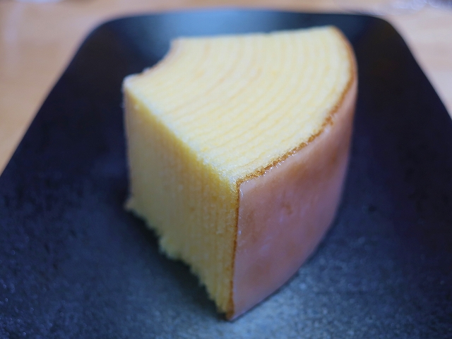 ここのバームクーヘンは外側にフォンダン(糖蜜?)が掛けられています。