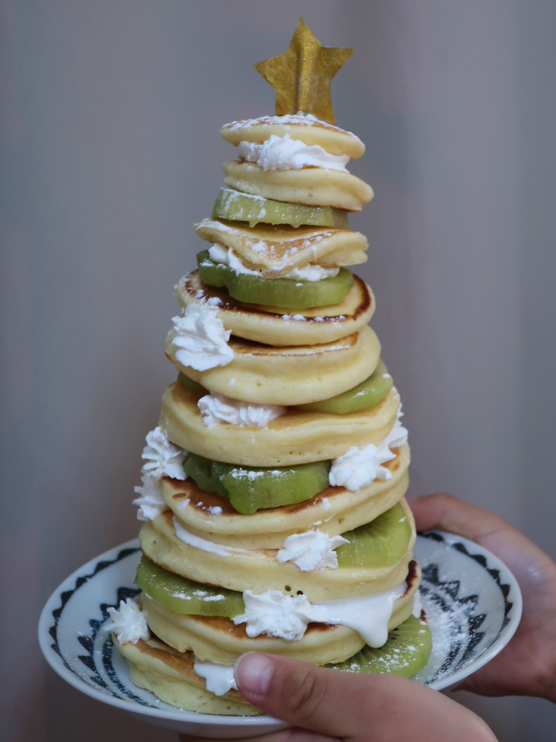 特価のキウイと特価のホットケーキミックスと前回の手作りケーキの残りの生クリーム(冷凍させてた)があったので、パンケーキツリーを作ってみました。
