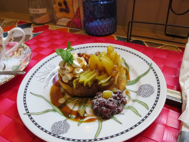 和テイストの栗きんとんも、そのきんとんのザラっとした舌触りと喉の奥の方にじんわりくる独特の甘みが実にフレンチトーストによく合いました。