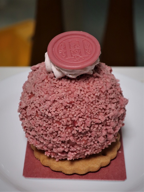 ドームの中は、外側がイチゴのムース。中にピスタチオのババロアと書いてあったけど、さらに他にも違うムースも入って、色鮮やかな三種構造。