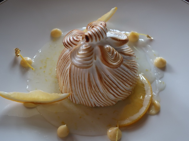 ベテランぽいスタッフがワゴンで運んできたのは、爽やかなレモンの黄色とメレンゲで形どられたリボンの造形が美しい一皿。わずかに金粉も散らしてあります。