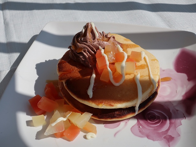 トロピカルフルーツ缶詰と生クリームが余っていたので、お昼ご飯はホットケーキにしてみました。