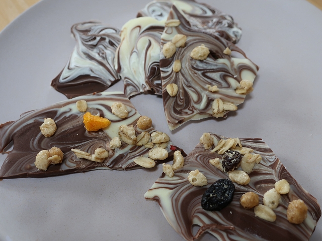 作り方は、板チョコを並べてレンジで溶かして爪楊枝でマーブルを作るという簡単なもの。(好みでトッピングも)
