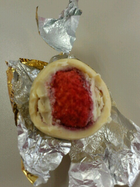 中の赤い部分はフリーズドライのベリーっぽく見えるけど、これがまた、劣化したスポンジのようにスカスカなのにべチャットひっつく。