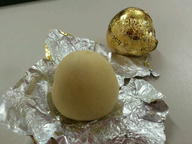 外側の白い部分はチョコだろうと思って齧ったら、固っ!