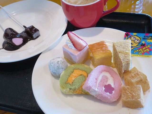 料理はステーキをメインに和洋いろいろとあって、さすがUSJ、恐竜の足跡の形のハンバーグなどもあり楽しかったのですが、デザートも多数あって良かったです。