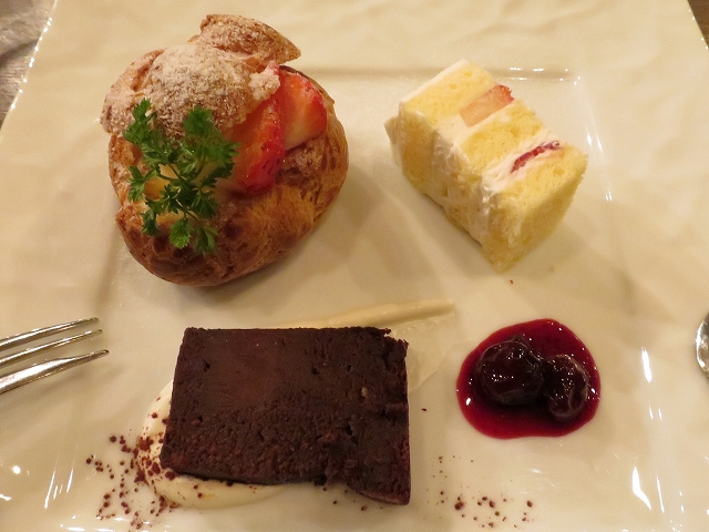 コースをいただいたのですが、フレンチかイタリアンかよく分からない洋食で、どれもオシャレに盛り付けてあって美味しかったです。