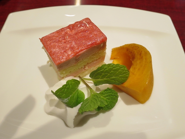 なんのケーキかよく分からないけど、華やかで可愛らしいピンクの、しかもパールがかったジュレが乗っていて、さながらジュエリーのような美しさのレイヤー仕上げ。