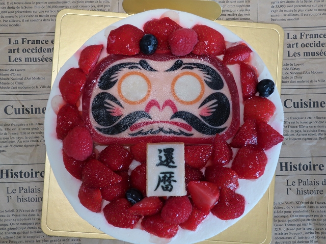 私と妹からは「還暦」プレート入り、迫力満点ダルマのケーキ!!