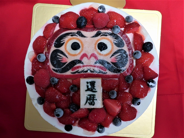 6号サイズのケーキ(楽天スーパーセールでちょっと割引されてたのでサイズアップできた♪)にドーンとダルマの顔!!