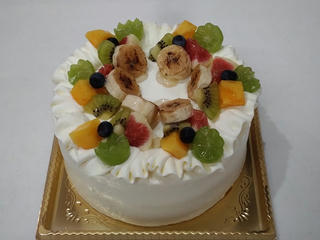 うまく円周側にフルーツデコが配してある専用ケーキ。