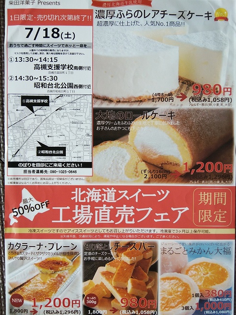 「北海道スイーツ工場直売フェア」と書かれており、うちの社宅の前の道路で45分間だけケーキやスイーツ類を移動販売するらしい。