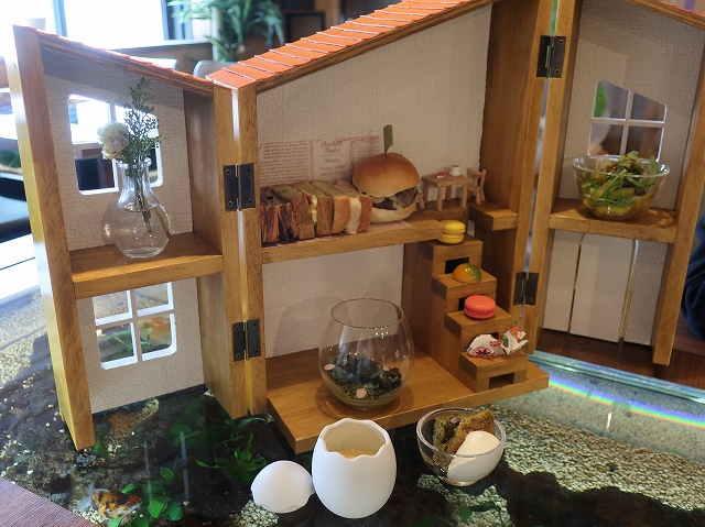 生き物が入ってる水槽って手入れがけっこう大変と思うんですが、クリアな水が維持されていて、ひらひらと泳ぐ金魚が間近で見れて、非常に優雅です。