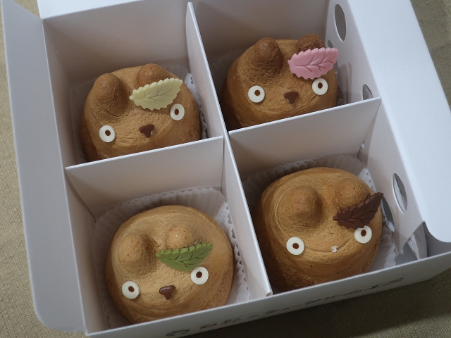 4体入っているトトロは耳に着いてる葉っぱの色がそれぞれ違ってて、白がバニラ、茶色がチョコ、ピンクがストロベリー、緑が抹茶あずきのクリームが入っています。