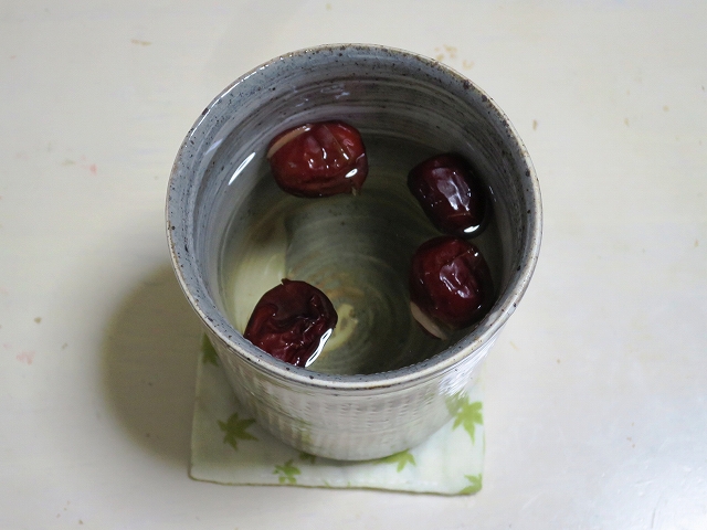 乾燥棗を粗くほぐして、お湯を注ぎ、ある程度成分が抽出されたであろう頃にいただきます。