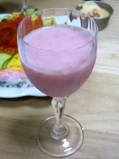 三月三日。 今日はひな祭り。 今年は頑張って三色ひなケーキ寿司を作ってみたので、デザートはなし。 なのですが、母が手作り甘酒とイチゴを送ってくれたので、イチゴ甘酒を作ってみました。 作りかたは、イチゴ6個と甘酒200㏄をミキサーにかけるだけ。 ひな祭りらしいキュートなピンクで見た目もよし。 飲んでみると、適度な酸味と甘味で、さながら飲むヨーグルトの味わい。 甘酒特有のコメの粒々感もなくなって、口当たり良く飲みやすかったですね。 それでも息子は飲まなかったけど。