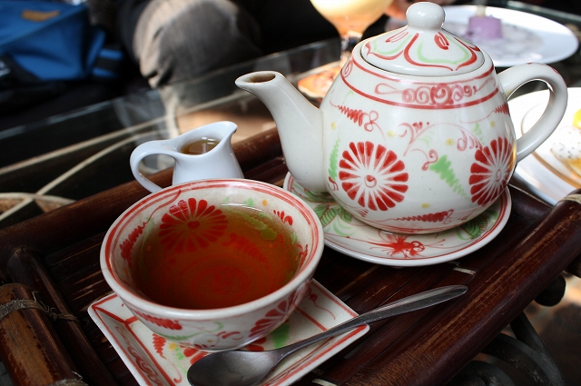が、とてもかわいいバッチャン焼の茶器セットでサーブされ、異国情緒たっぷりです。