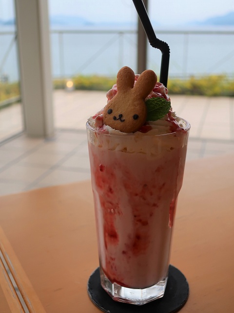 ストロベリーでレアチーズなシェイクですって。かわいいウサギのクッキーまで乗ってるんですよ。