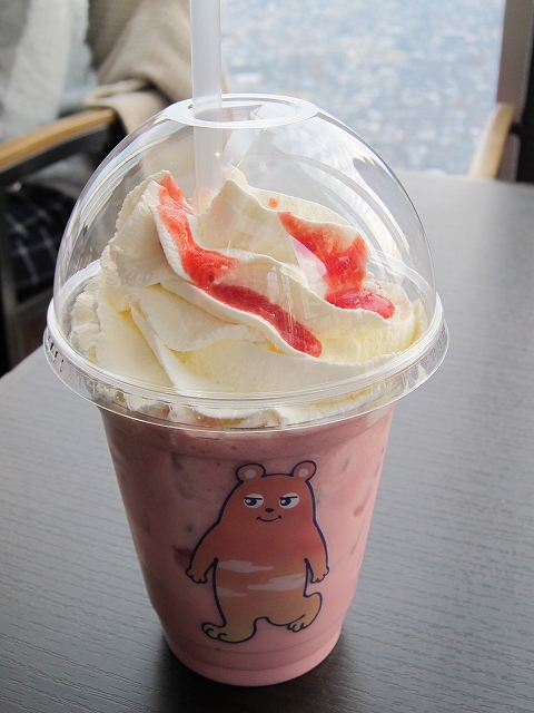 "あべのべあ"というハルカスのマスコットキャラの大好物の雲に見立てた生クリームがドンと乗ったラテです。