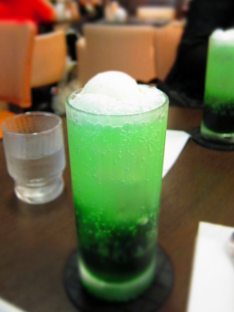 ちょっとエグいくらいに緑が鮮やかなソーダの上に、お子様が喜ぶアイスクリーム!