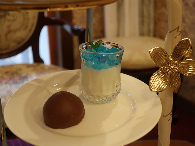 瑠璃色に金縁の美しいプレートが乗ったオリジナルの金色ティースタンドが登場するうえに、アンティーク家具が設えられた個室でいただけるという豪華な設定。