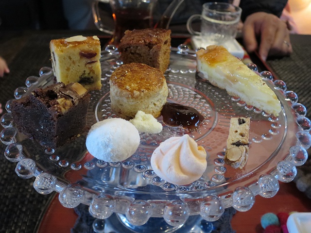 小さくカットされたずっしり系ケーキが4点と、スコーンと軽めの焼き菓子が3つ。