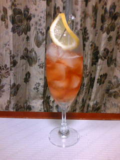レシピは、ジンをベースにレモンジュース、グレナディンシロップを入れシェーク。クラッシュドアイスをグラスに詰めたかったんですが、うまくクラッシュ出来なかったので普通の氷。その上からスライスレモン(と本来はミント)を飾ります。レモンは本当は沈めるみたい。