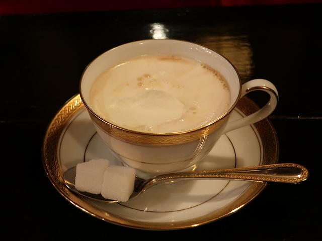 ホイップクリームが浮かべられて、スプーンには角砂糖2個。