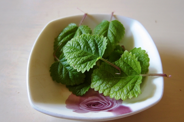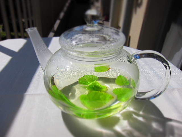 まだ黒ずみができていない(あるいは少なめ)の葉を9枚摘んでよく洗い、ポットに入れて約300ccの熱湯を注ぎ待つこと数分。