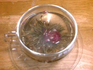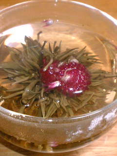 花茶というのは、茶葉を丸くかためて縛ったもので、湯を注ぐと葉が開き花が咲いたように見えるお茶の種類です。今回のは真ん中にジャスミンの花も編み混んであります。パッと開いた状態はほんとにきれい。目にも美しいお茶です。