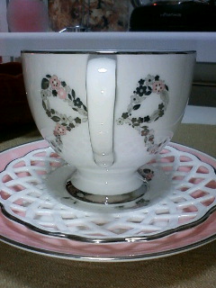 ソーサーは二種類。お茶請け用のお皿としても使えるみたい。画像は豪華に重ねて二段ソーサーにしてみました。レース仕上げの小さい方のソーサーにもリボンの絵が描いてあります。