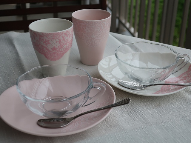 ピンクと白のフォルムも可愛らしい湯飲みペアと、ソーサーがピンクと白でカップはガラスという、これまたかわいいペアカップ。華奢なスプーンも付いてます。
