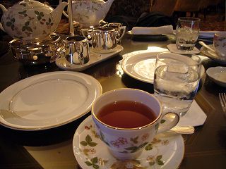 さて運ばれてきました。さすが茶器はウェッジウッドのワイルドストロベリー。ストレートにクラシカルです。ちゃんとポットウォーマーまであります!すごいなぁ。本格的。